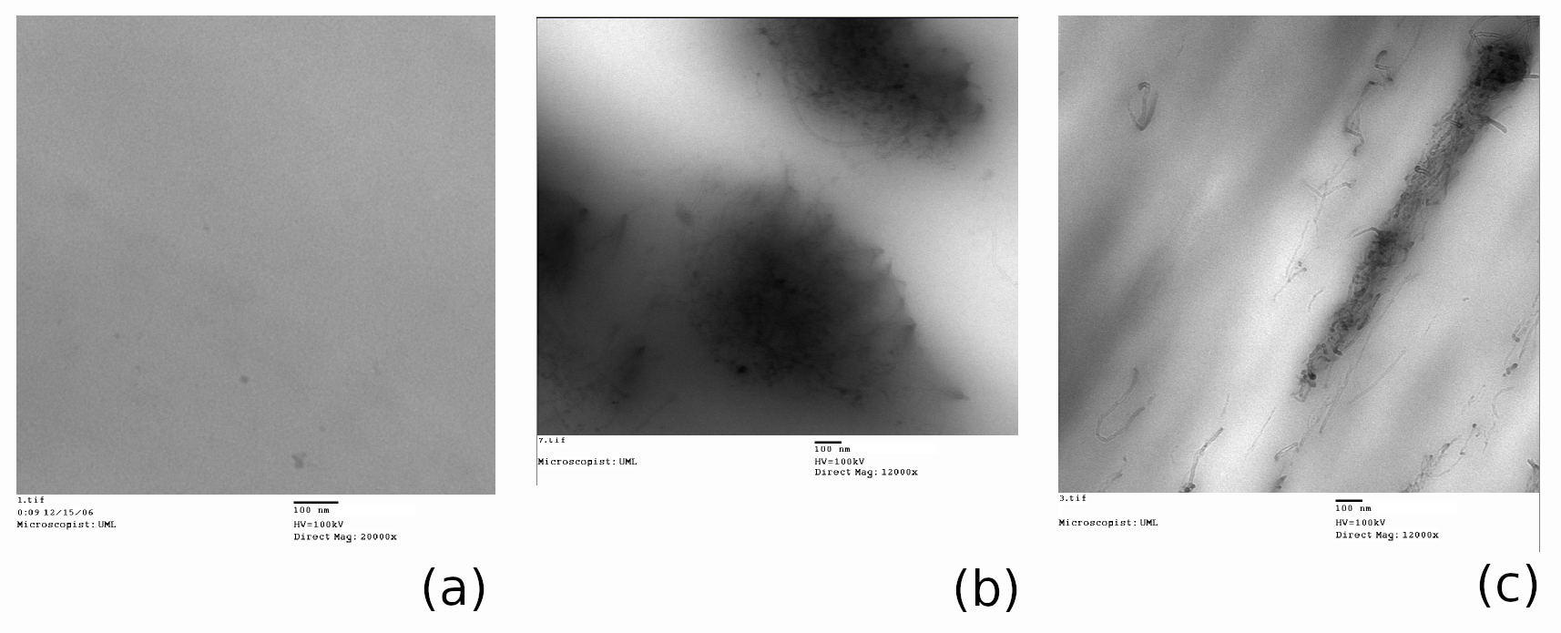 Figure 2: TEM images for (a) virgin Polypropylene (PP) material, and 2weight % CNT-PP composites at injection rate of (b) 1in/s, and (c) 7in/s.