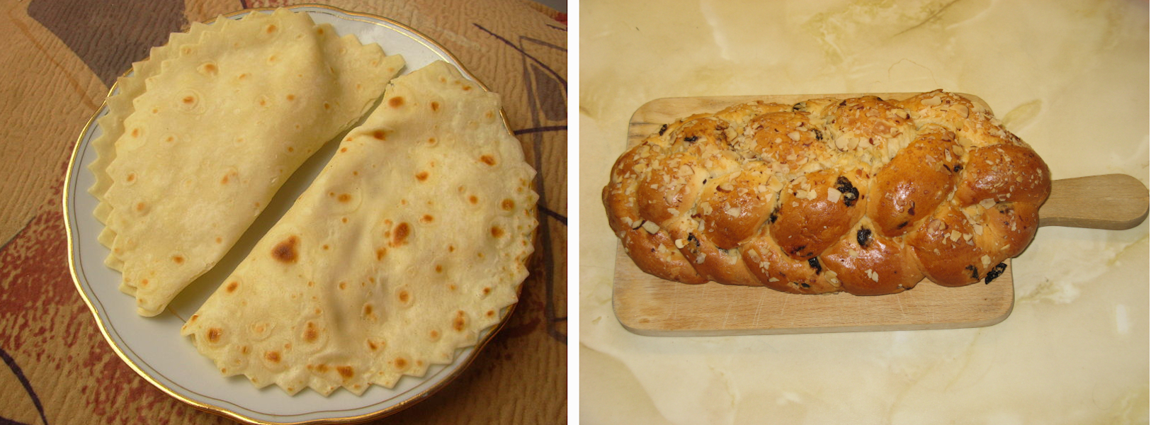 Left-side image: Qistibi is roasted flatbreads with various fillings inside. Image Credit: https://en.wikipedia.org/wiki/Qistibi; Right-side Image: Traditional Czech sweet bread called Vánočka is sold all year round in the Czech Republic, but Czechs mostly buy and eat it on Christmas morning with a hot cup of káva (coffee) or čaj (tea). Image Credit: https://en.wikipedia.org/wiki/Vánočka