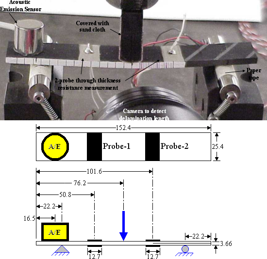 Furthermore, I have also worked on self-sensing of damage in carbon fiber reinforced structures and systems. Carbon fiber composites are basically piezoresistive and electrically conductive. Thus, the material characteristics provide damage and strain self-sensing capabilities. Self-sensing means that the material itself functions as a sensor and, thereby, eliminates cumbersome third-party sensor embedding, which presents technical barriers to the aircraft manufacturers as well as economic burden to airlines. In self-sensing, electrical contacts (electrodes) play an extremely important role in electrical resistance signal acquisition form flight critical composite aircraft structures. Hence, electrodes must be functionally effective, durable, and protected from flight environmental hazards. The use of change in electrical resistance for monitoring fracture process has been used in a set of tests we conducted to validate the effectiveness of the technique. Both static and fatigue tests on Double Cantilever Beam (DCB) and End Notch Flexure (ENF) specimens were conducted and the self-sensing technique showed effectiveness vis-à-vis crack detection capability. The figure below shows the experimental set-up of an ENF specimen for fracture detection.