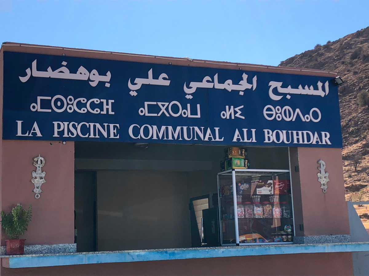 Tifinagh, the Amazigh alphabet, is now visible on most administrative buildings in Morocco. This photo, taken in a small village in the Atlas Mountains, shows the trilingual signage on a communal swimming pool.